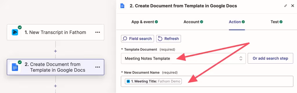 After configuring your Zap trigger, add an action using Google Doc's "Create Document from Template." In the "Action" tab, select your meeting notes template as the "Template Document" and map the meeting title from the trigger to the field titled "New Document Name."