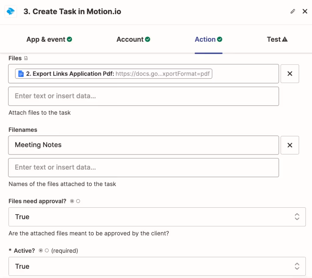 - Task Title: Enter a custom value for the title of each Motion.io client task this Zap will create, for example, "Review Meeting Notes."