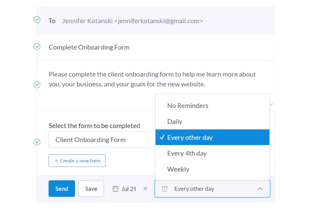 Assign tasks that notify clients of upcoming "To-Dos" and set a custom reminder sequence to send automatic follow-up emails until tasks you assign are completed.