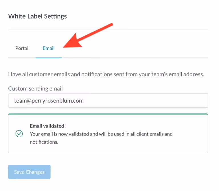 To specify the email address you'd like clients to receive notification emails from, click the "Email" tab under "White Label Settings" on your account settings page and follow the instructions.