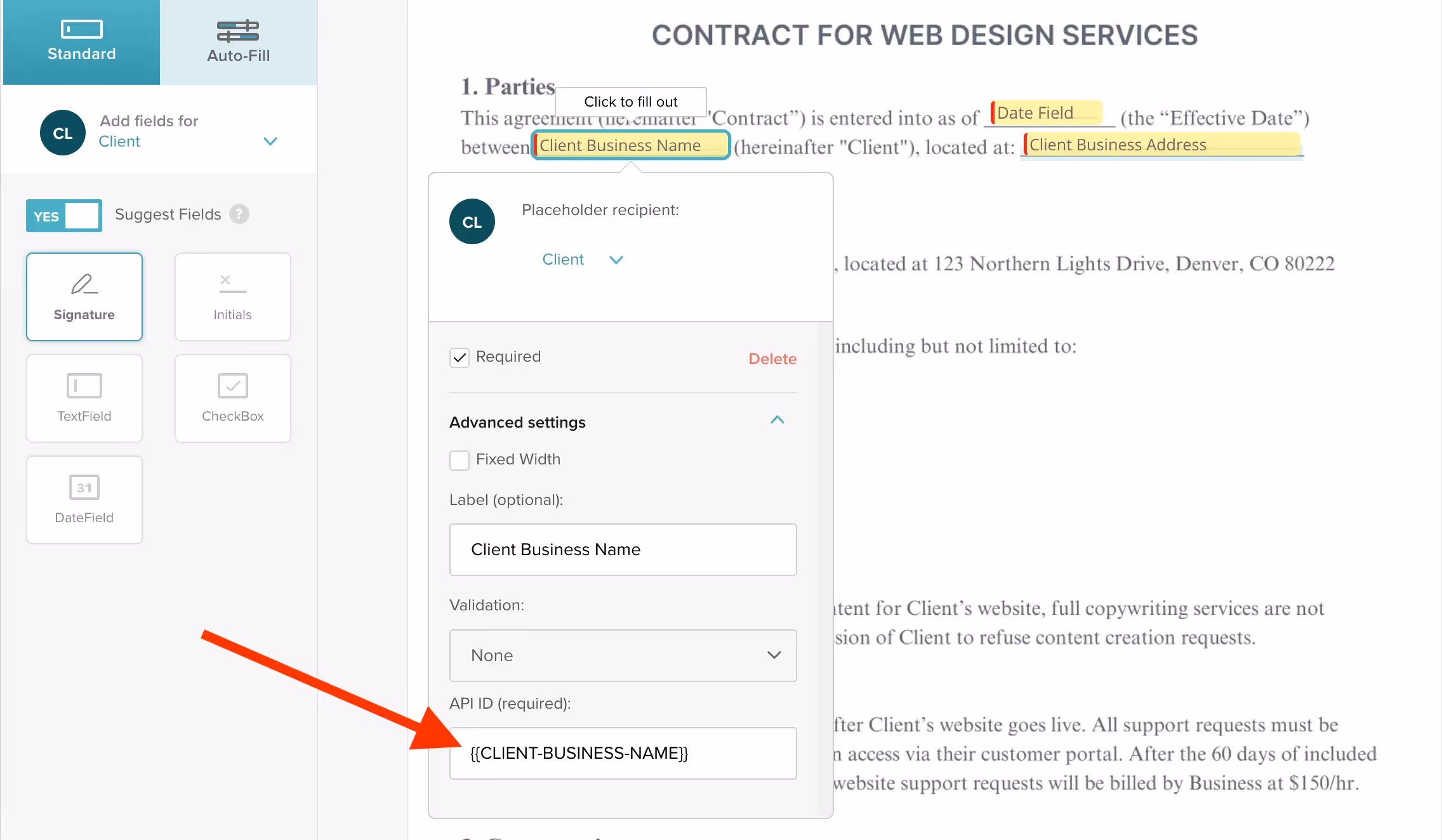 - In your Motion.io Contract Template, add a new text field and paste the slug for the custom field you wish to populate (e.g., {{CLIENT_BUSINESS_NAME}}) in the "API ID" section.