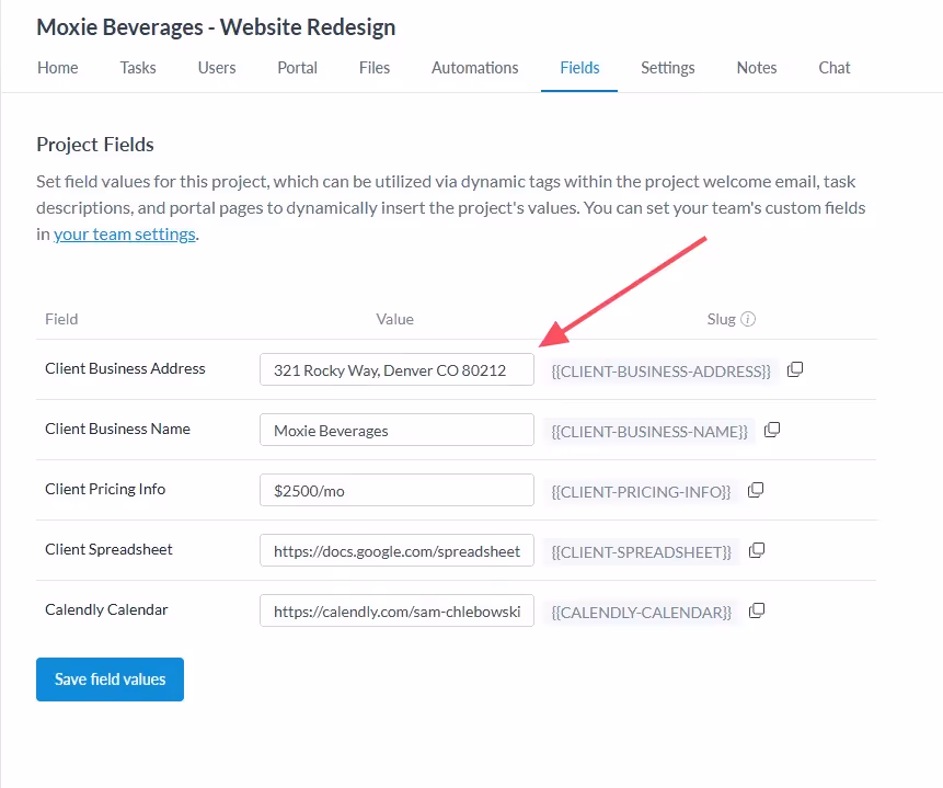 Important: After creating new custom fields in Motion.io, make sure to specify the value for each field within your projects. Just open a project (or project template), head to Settings > Fields, and enter the details—like the client’s name, project start date, or embed link—that should populate anytime that field is used. Alternatively, you can automate the process of setting custom field values by configuring your Motion.io forms to populate them or using Motion.io's Create Project Zapier action.