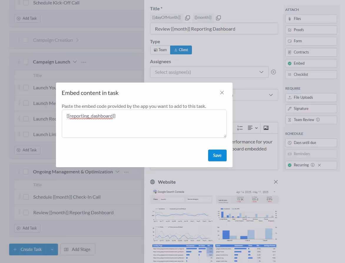 - Click the "Embed" option in the task composer, and paste the slug for your custom field (ex., {{reporting_dashboard}}).