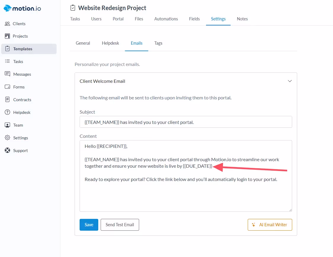 Custom fields can take that off your plate. They let you store important client information once, and Motion.io will automatically insert it wherever you need it.