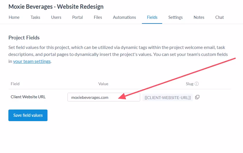 When you update the value for the custom field, Motion.io will automatically flow that update through to every task, contract, or project tab where you’ve used {{client_website_url}}.