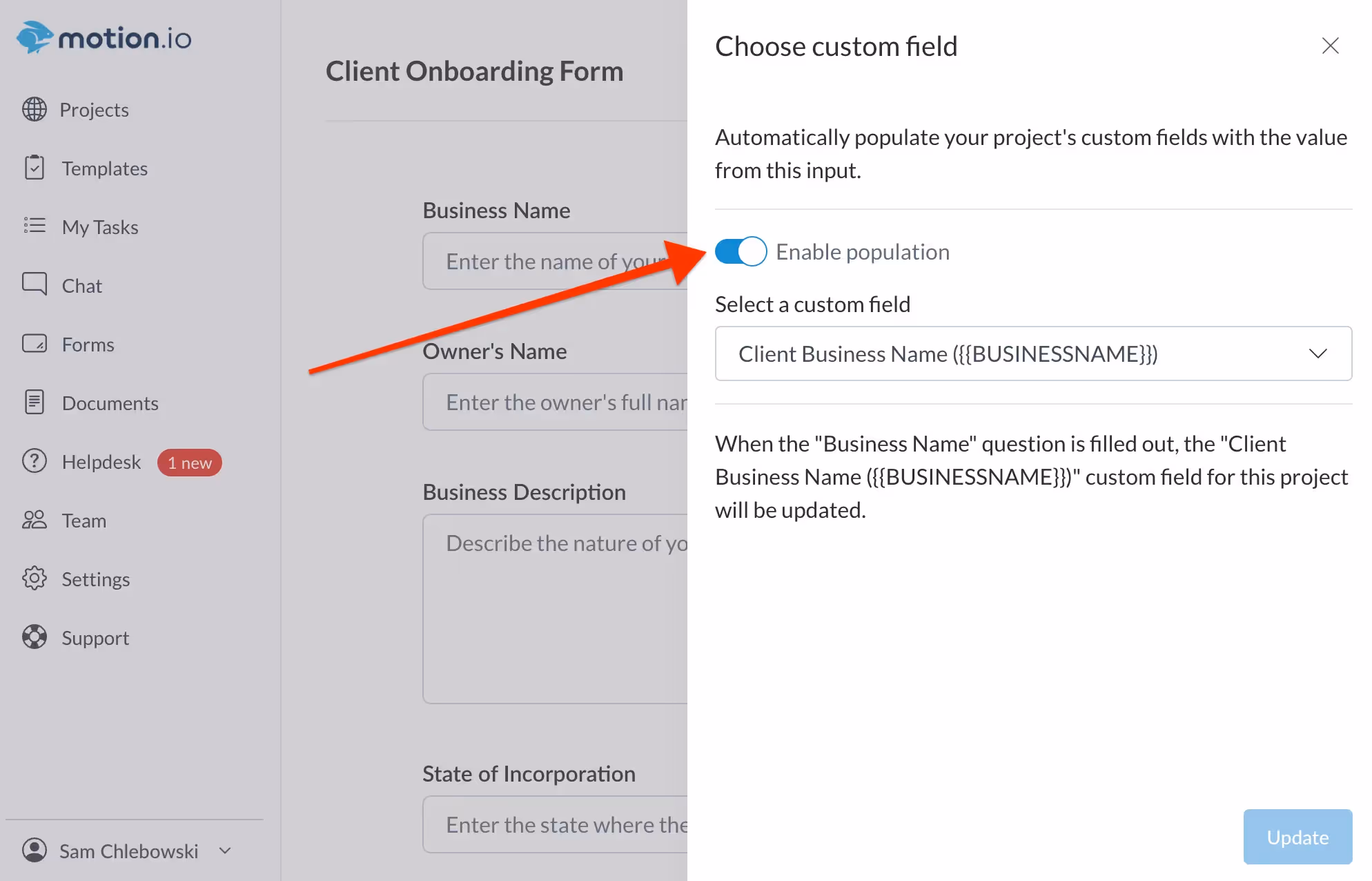 Using Motion.io's custom fields, you can eliminate manual data entry work by automatically populating the information clients enter when completing an onboarding form anywhere else in the project.
