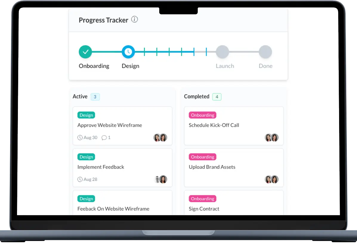 Give your clients a visual roadmap and progress tracker so they always know what’s next — and your team isn’t buried in “where are we at?” emails.